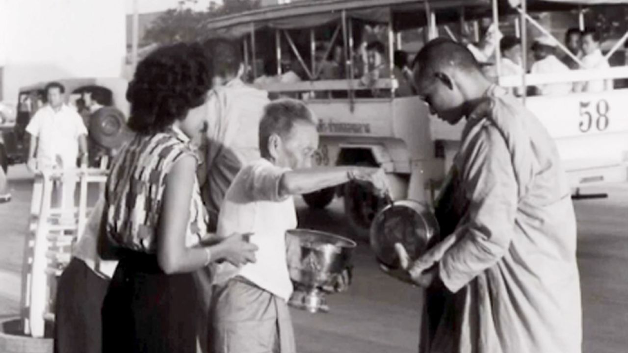 ยายสุมรเล่าว่า “...ตอนที่ในหลวงเสด็จฯ มา เขาไม่ได้ห้ามรถ ไม่มีขบวน ไม่มีรถนำ มีรถมาแค่สองคัน อีกคันเป็นช่างกล้อง...ทรงมารถเก๋งดำ เสด็จฯ ผ่านถนนเพชรบุรีฯ เพื่อจะไปรับบาตรจากสมเด็จฯ พระพันวัสสาอัยยิกาเจ้าที่วังสระปทุม  ทีนี้พอทอดพระเนตรเห็นคนแก่ ก็ทรงให้จอดรถลงรับบาตร...ทีแรกยายไม่รู้ว่าเป็นในหลวง แต่แปลกใจว่าทำไมพระรูปนี้ลงมาจากรถ  ตอนนั้นทรงสวมแว่นดำ พระบาทเปล่า มีพระพี่เลี้ยงลงมาด้วย  ยายก็...เอ๊ะ เดี๋ยวเดียว มีคนข้างหลังบอกว่าพระเจ้าแผ่นดิน โอ้โห ขนลุก ปลื้มปีติ วันนั้นยายตื่นเต้นทั้งวัน”