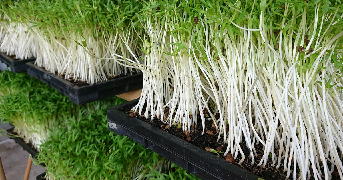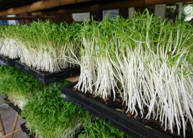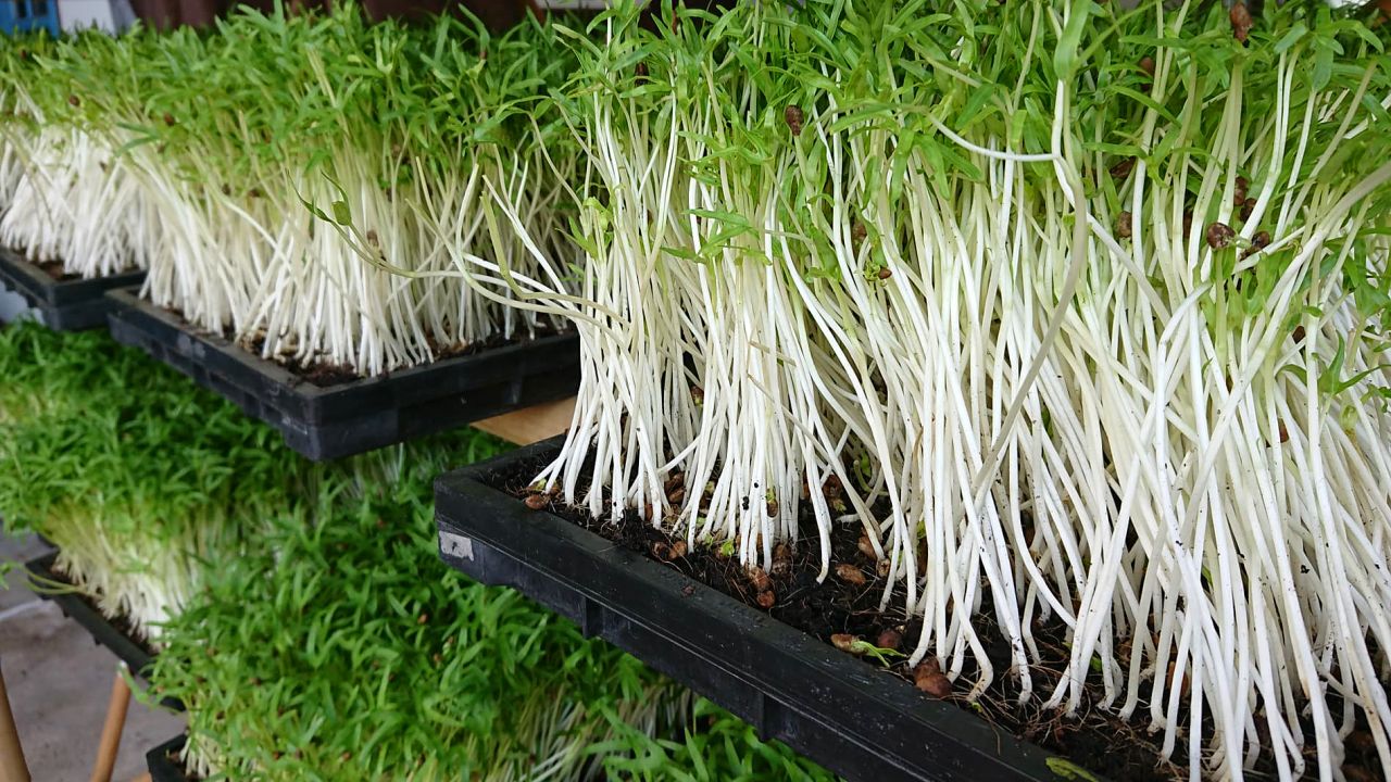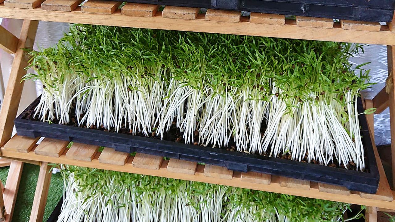 ตั้งไว้ 2 วัน จากนั้นนำถาดเพาะเข้าไปวางเรียงในห้องทึบแสงที่อากาศถ่ายเทดีอีก 3 วัน ต้นอ่อนจะงอกยาวตั้งตรง จึงนำออกมาตั้งไว้ที่ที่มีแสงแดดส่องถึง ให้ใบสร้างคลอโรฟีลล์อีก 2 วันจนมีสีเขียวสด รวมเวลา 7 วันก็เก็บเกี่ยวได้