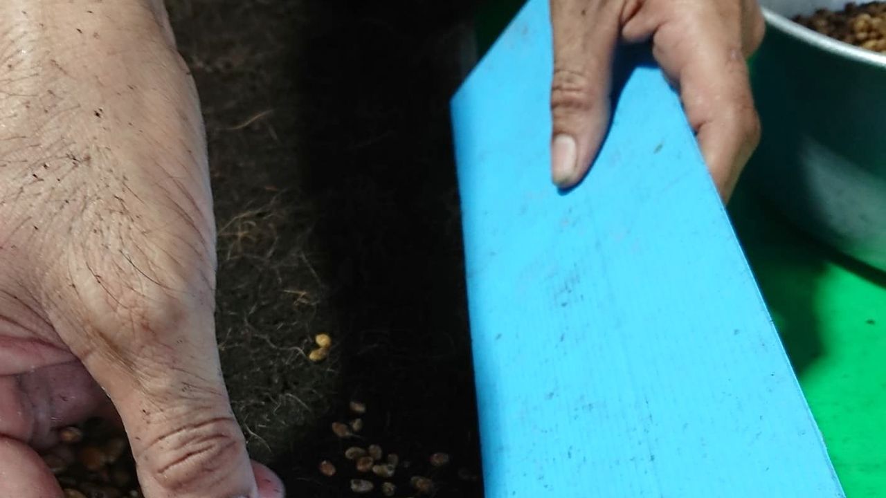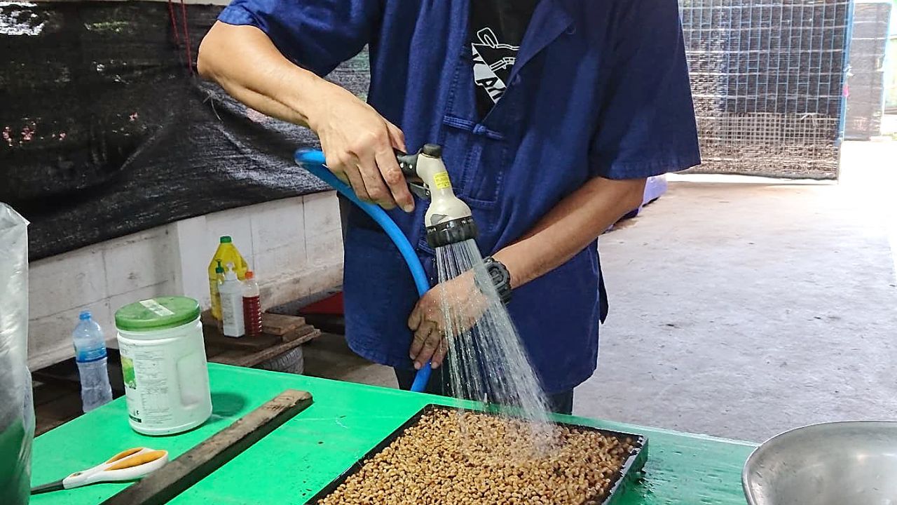 เมล็ดผักบุ้งที่ใช้เพาะต้องเป็นเมล็ดพันธุ์อินทรีย์ นำไปหว่านลงในถาด รดน้ำพอหมาด นำกระสอบพลาสติกปิดด้านบน แล้วทับด้วยถาดเพาะชุดอื่นซ้อนกันเพื่อให้รากงอกลงดินได้เร็วขึ้น
