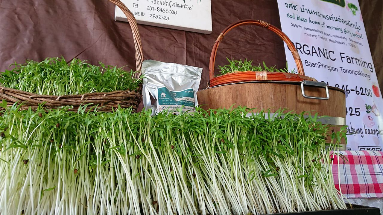 ฟาร์มนี้มีผลผลิตจำหน่ายหลายชนิด ราคาไม่แพง อย่างต้นอ่อนผักบุ้งอินทรีย์ ขายแพ็กละ 2 ขีด 50 บาท กิโลละ 250 บาท ต้นอ่อนผักบุ้งมีประโยชน์มากกว่าต้นโตเต็มวัย 5-10 เท่า มีสารต้านอนุมูลอิสระ ช่วยบำรุงสายตา บำรุงสมองและหัวใจ ช่วยลดน้ำตาลและคอเลสเตอรอล มีไฟเบอร์สูงแต่แคลอรีต่ำ