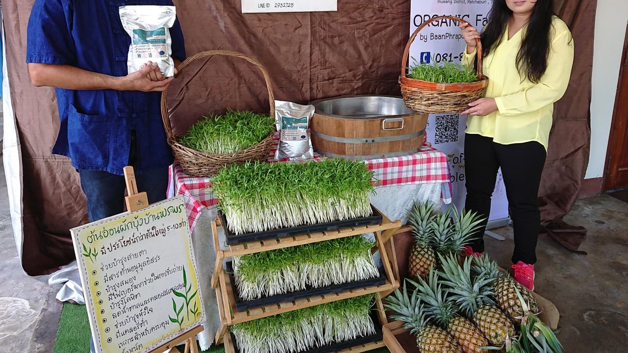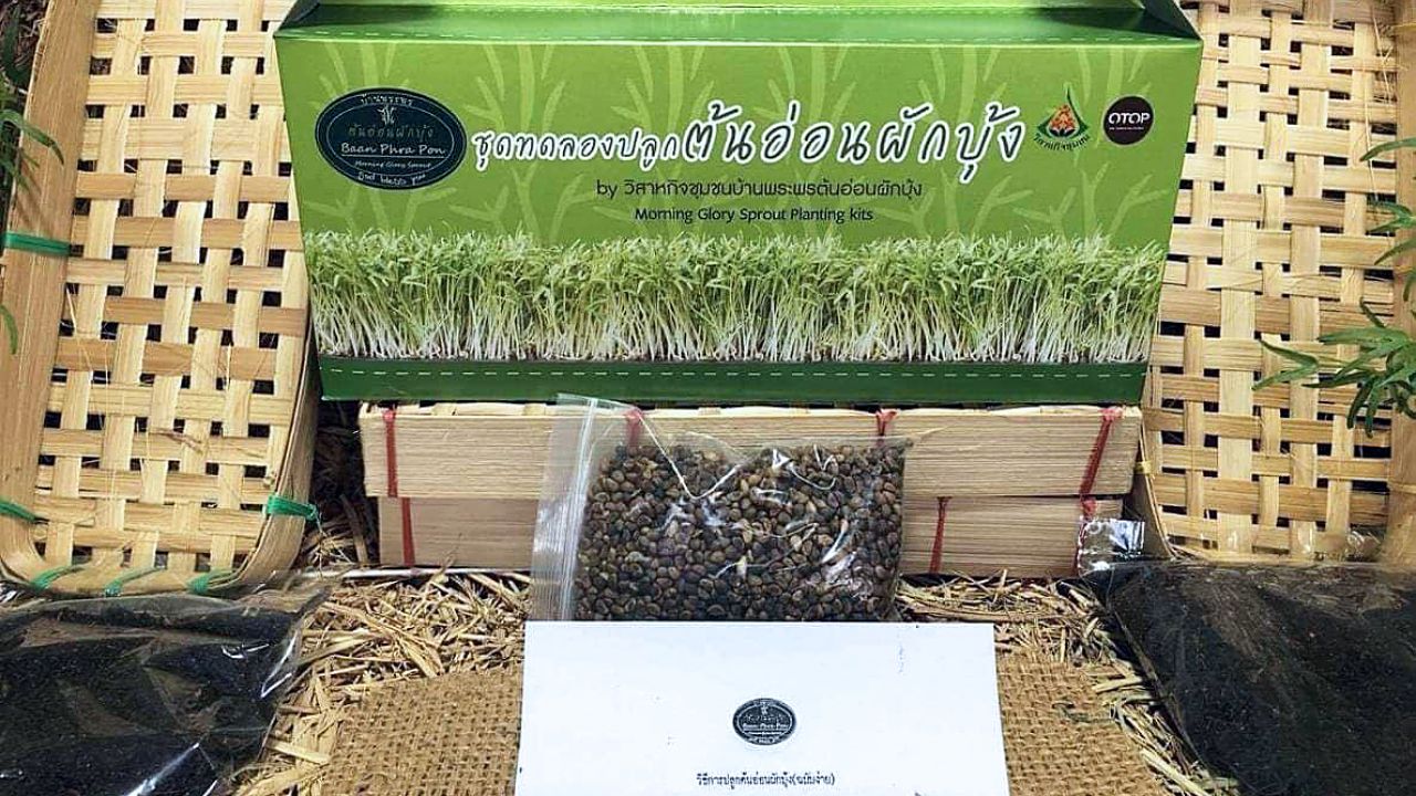 ทั้งมีชุดเมล็ดผักบุ้งอินทรีย์ไม่ตัดต่อพันธุกรรม จำหน่ายกิโลละ 250 บาท นำไปปลูกต่อเพื่อเก็บเมล็ดพันธุ์ได้ (อัตราการงอก 98%) ชุดทดลองปลูกต้นอ่อนผักบุ้ง “ชุดปฐมพร” ชุดละ 350 บาท สำหรับมือใหม่หัดปลูกและผู้ที่สนใจเรียนรู้ นำไปต่อยอดเป็นอาชีพต่อไป